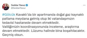 Kocaeli Valisi Seddar Yavuz, Gölcük’te meydana gelen patlamaya ilişkin yaptığı açıklamada, “Doğal gaz kaynaklı patlama meydana gelmiş olup, iki vatandaşımızın tedavisi hastanede devam etmektedir. Valiliğimizin koordinasyonunda inceleme, araştırma devam etmektedir. Lüzumu halinde bina boşaltılacaktır” dedi.