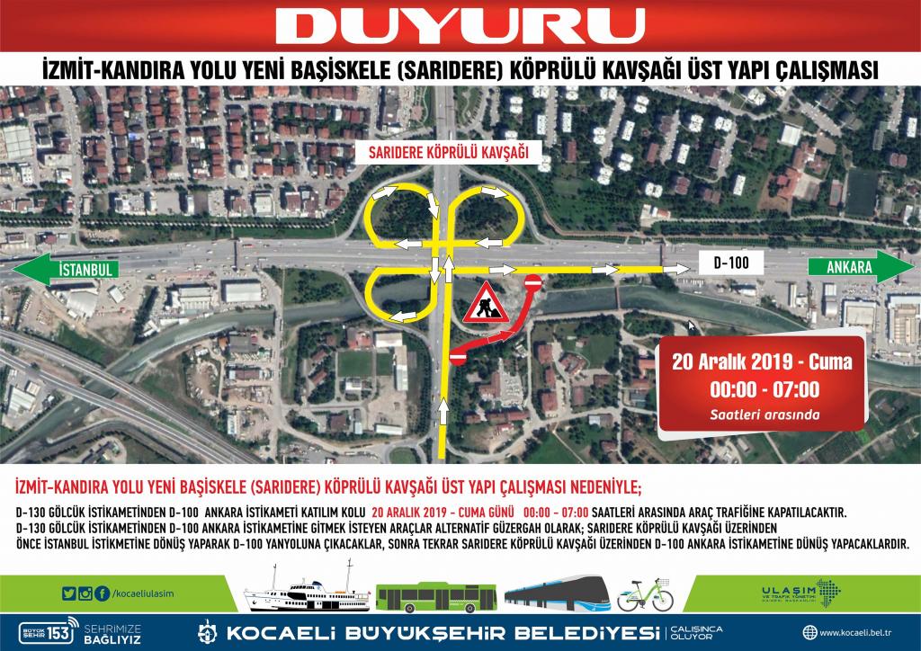 Çalışma sürecinde D-130 karayolundan D-100 istikametine gitmek isteyen araçlar, alternatif güzergâh olarak Sarıdere Köprülü Kavşağı üzerinden önce İstanbul istikametine dönüş yaparak D-100 karayoluna çıkacak. Araçlar tekrar Sarıdere Köprülü Kavşağı üzerinden D-100 Ankara istikametine dönüş yapacak.