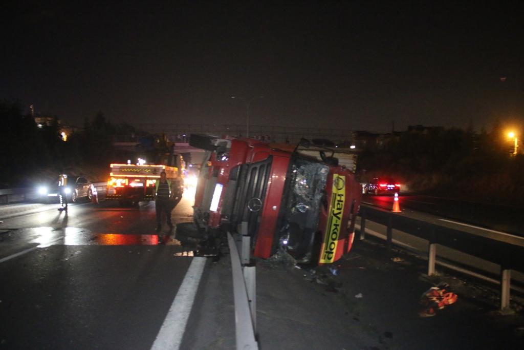 TEM otoyolu İstanbul istikameti Derince İlçesi Yenikent Mahallesinde meydana gelen trafik kazasında, Ertan Ülker idaresindeki 34 AR 0630 çekici plakalı TIR, Derince Yenikent Köprüsü mevkisinde sürücüsünün direksiyon hakimiyetini kaybetmesi üzerine yolun sağ tarafındaki tabelaya çarparak orta refüje devrildi.Çevrede kazayı gören diğer sürücülerin haber vermesi üzerine olay yerine itfaiye, polis ve sağlık ekipleri sevk edildi. Kazada araç içinde mahsur kalan sürücü Ülker, ekiplerin çalışması ile araçtan çıkartarak ambulansa alındı. Yaralının sağlık durumunun iyi olduğu öğrenilirken kaza nedeniyle TEM otoyolunun her iki yönünde de uzun araç kuyrukları oluştu.Kazada yaralanan sürücü Ertan Ülker, sağlık ekiplerinin müdahalesinin ardından ambulansla Derince Eğitim Araştırma Hastanesine kaldırıldı. Yola devrilen TIR ise karayolları ekiplerinin yaklaşık 3 saat süren çalışmalarının ardından vinçle olay yerinden kaldırılarak otoparka götürüldü. Polis ekipleri kazayla ilgili inceleme başlattı.