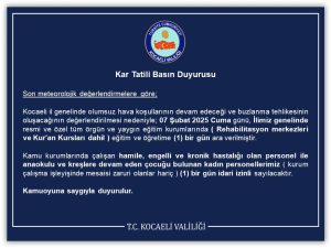 Kocaeli Valiliği’nden son dakika duyurusu. Kocaeli’de 07 Şubat 2025 Cuma günü eğitime ara verildi.