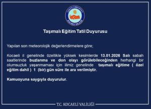 Kocaeli Valiliği, Meteoroloji Genel Müdürlüğü’nden alınan son değerlendirmeler doğrultusunda il genelinde taşımalı eğitime 1 gün ara verildiğini duyurdu.