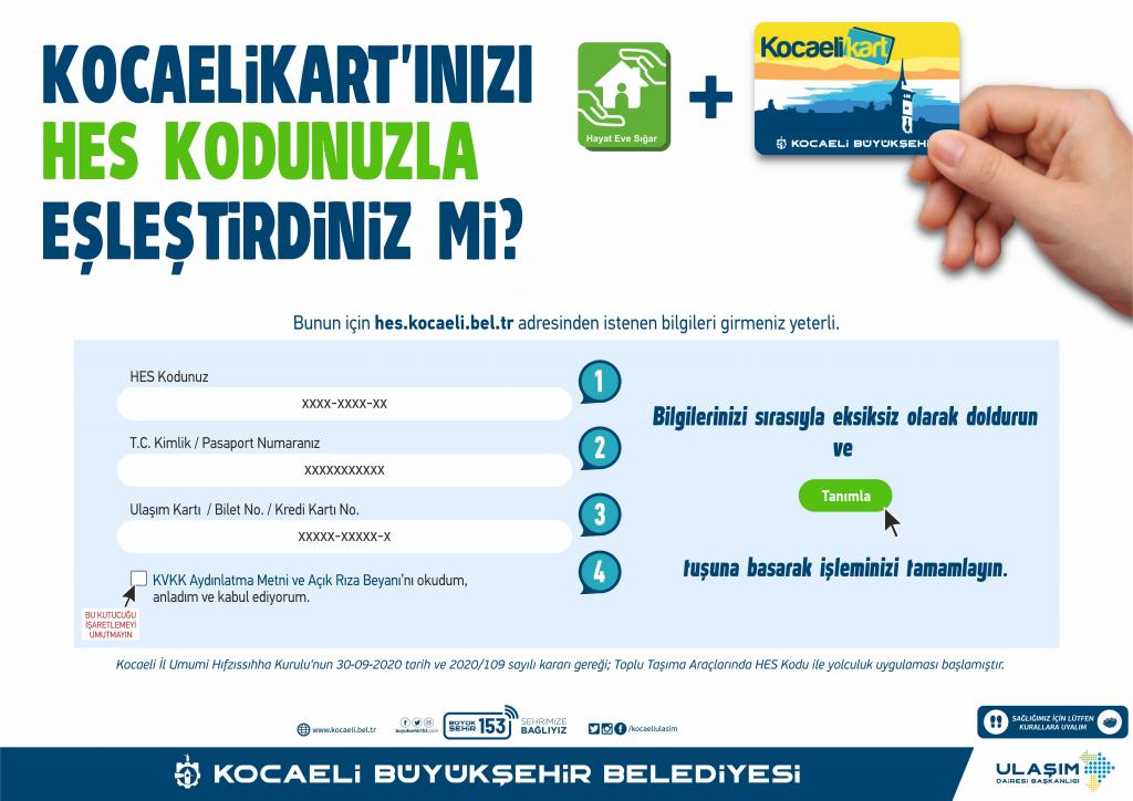 Covid-19 salgınına karşı mücadele kapsamında Kocaeli Büyükşehir Belediyesi, yeni bir uygulamayı hayata geçiriyor. Bu kapsamda Kocaeli genelinde toplu taşıma hizmetinde kullanılan Kocaeli Kart’a HES kodu özelliği getirildi. Sağlık Bakanlığı’nın HES Servisi ile ilgili testler sonucunda, Bakanlık onayı ile birlikte HES sorgusuyla deniz ulaşım, tramvay, belediye otobüsleri, özel halk otobüs ve minibüslere binilmesi sağlanıyor.