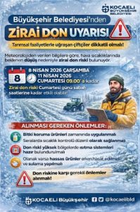 Kocaeli Büyükşehir Belediyesi tarafından yapılan açıklamada, söz konusu riskin 8 Nisan Çarşamba (yarın) günü saat 00.00 itibarıyla başlayacağı ve 11 Nisan Cumartesi günü saat 09.00’a kadar etkili olmasının beklendiği ifade edildi. Kocaeli Büyükşehir Belediyesi ayrıca, il genelindeki çiftçilere zirai don riskine karşı bilgilendirme amacıyla SMS gönderdi.