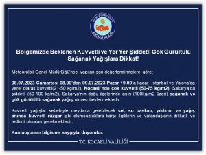 Kocaeli Valisi Seddar Yavuz, vatandaşları uyardı. Vali Yavuz uyarısında ‘İlimizi ve bölgemizi hafta sonu etkisi altına alacak yağışlı hava nedeniyle dikkatli ve tedbirli olunması ve dere yataklarından uzak durulması gerekmektedir. Kuvvetli ve yer yer şiddetli sağanak yağışlara dikkat edelim’ İfadelerine yer verdi.