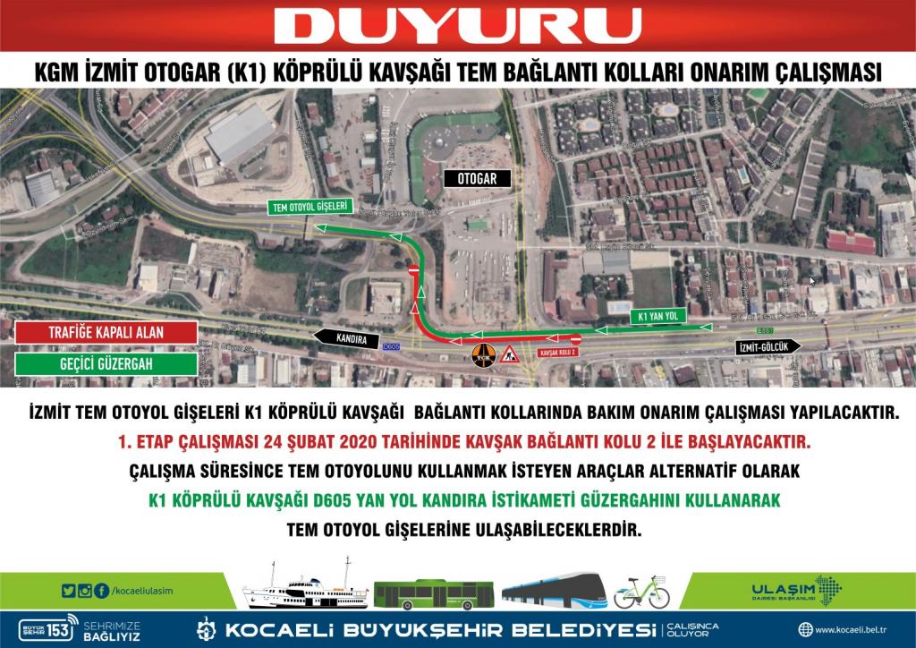 Karayolları Genel Müdürlüğü 24 Şubat Pazartesi günü itibariyle İzmit İlçesi tem otoyolu gişeleri K1 Köprülü Kavşağı bağlantı kollarında bakım onarım çalışması başlattı. 2. bağlantı kolunda yapılan çalışmalar nedeniyle Kocaeli Büyükşehir Belediyesi Ulaşım Dairesi Başkanlığı’nca geçici güzergah oluşturuldu.