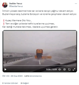 Kocaeli Valisi Seddar Yavuz, Kuzey Marmara Otoyolu ve yüksek kesimlerde etkili olan kar yağışı nedeniyle uyarıda bulundu. Vali Yavuz sosyal medya hesabından şu paylaşımı yaptı: “İlimizin yüksek kesimlerinde kar ve karla karışık yağmur devam ediyor. Buzlanmaya karşı, tuzlama solüsyon ve küreme çalışmaları devam ediyor. Kuzey Marmara Oto Yolu , Tem ve diğer yollarda trafik kurallarına uyulması, kar lastiği mutlaka takılması, ikazlara uyulması gerekir.”