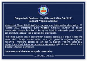 Kocaeli Valisi Yavuz vatandaşları uyardı. Vali Yavuz uyarısında ‘Değerli Kocaelili Kardeşlerim, Meteorolojik verilere göre yarın İlimizde kuvvetli sağanak yağış beklendiğinden, dere yataklarından uzak durulması ve dikkatli ve tedbirli olunması gerekmektedir. Lütfen dikkatli olalım’ İfadelerine yer verdi.