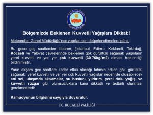 Kocaeli Valiliği’nden son dakika uyarısı. Valilik yaptığı açıklamada Kocaelili vatandaşları kuvvetli yağışlara karşı uyardı.