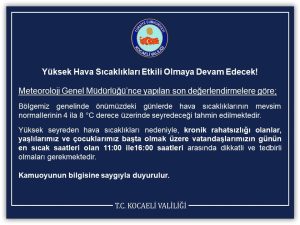 Kocaeli Valiliği’nden uyarı geldi. Yapılan açıklamada, ‘ Bölgemiz genelinde önümüzdeki günlerde hava sıcaklıklarının mevsim normallerinin 4 ila 8 derece üzerinde seyredeceği tahmin edilmektedir. Vatandaşlarımızın günün en sıcak saatleri olan 11:00 – 16:00 saatleri arasında dikkatli ve tedbirli olmaları gerekmektedir’ İfadelerine yer verildi.