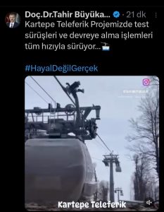 Vatandaşların İzmit Körfezi ve Sapanca Gölü’nü aynı anda izleyerek Samanlı Dağlarında yolculuğa çıkaracak Kocaeli’nin 50 yıllık hayali teleferik projesinde test sürüşü yapılıyor. Sosyal medya hesabından “Hayal değil gerçek” notuyla test sürüşünü başladığını duyuran Kocaeli Belediye Başkanı Tahir Büyükakın, “Kartepe Teleferik Projemizde test sürüşleri ve devreye alma işlemleri tüm hızıyla sürüyor” dedi.