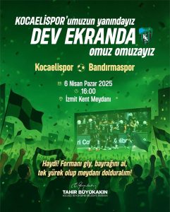 Kocaeli Büyükşehir Belediyesi, yarın saat 16.00’da Kocaelispor’un Bandırmaspor ile oynayacağı maçı İzmit Kent Meydanı’nda dev ekranda yayınlayacak. “Omuz omuzayız” sloganıyla gerçekleşecek bu özel etkinlik, Kocaelispor’a olan desteği güçlendirecek. “Formanı giy, bayrağını al, tek yürek olup meydanı dolduralım!” sloganıyla tüm Kocaelisporlulara çağrıda bulunan büyükşehir, Bandırma maçı heyecanını birlikte yaşamak isteyen tüm Kocaeli halkını dev ekranda takımlarına destek olmaya davet etti.