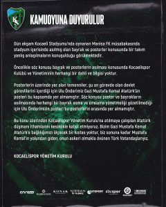 Kocaeli Stadyumuna asılan posterler arasında Atatürk posterinin olmaması şehirde tepkiyle karşılandı. Kocaelispor Yönetim Kurulu konuya ilişkin olarak bir açıklama yaptı. Kocaelispor Yönetiminden yapılan açıklamada, ‘ İfadeleri kullanıldı.