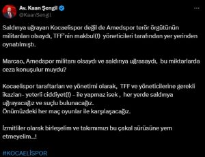 Kocaelispor Sakaryaspor maçında Kocaelispor’a yapılan saldırının tepkileri sürerken, Büyük Birlik Partisi Kocaeli İl Başkanı Av. Kaan Şengil’den sert tepki geldi. Şengil açıklamasında, ‘İzmitliler olarak birleşelim, takımımızı çakal sürüsüne yem etmeyelim’ ifadelerine yer verdi.