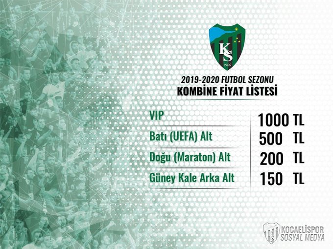 Sosyal Medya00Kocaelispor Yönetim Kurulu, 2019-2020 sezonu kombine bilet fiyatlarını belirledi.İŞTE KOMBİNE BİLET FİYATLARI Kocaelispor Kombine Bilet FiyatlarıKocaelispor KulübüKocaelispor Yönetimi