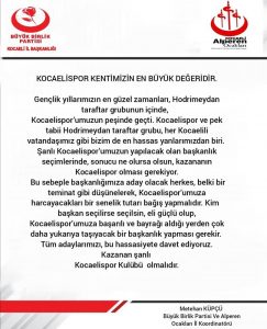 Yaklaşan seçim öncesi Kocaelispor başkan adaylarına Büyük Birlik Partisi’nden önemli çağrı geldi. BBP il Koordinatörü Metehan Küpçü, “Şanlı Kocaelispor’umuzun yapılacak olan başkanlık seçimlerinde, sonucu ne olursa olsun, kazananın Kocaelispor olması gerekiyor. Bu sebeple başkanlığımıza aday olacak herkes, belki bir teminat gibi düşünülerek, Kocaelispor’umuza harcayacakları bir senelik tutarı bağış yapmalıdır” dedi.