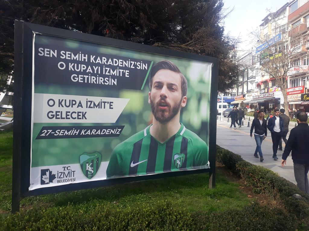 İzmit’in dört bir yanında yer alan görsellerde her futbolcunun fotoğrafları, numarası ve futbolcu adına yazılan özel mesajlar yer aldı. Başkan Hürriyet’in “O kupa İzmit’e” gelecek sloganının yer aldığı görsellerde “Sen Muhteşem Süleyman’sın o kupayı kaldıracaksın”, “Sen Sefa Narin’sin o kupayı İzmit’e getireceksin”, “Sen Semih Karadeniz’sin o kupayı İzmit’e getirirsin” ifadeleri kullanıldı.