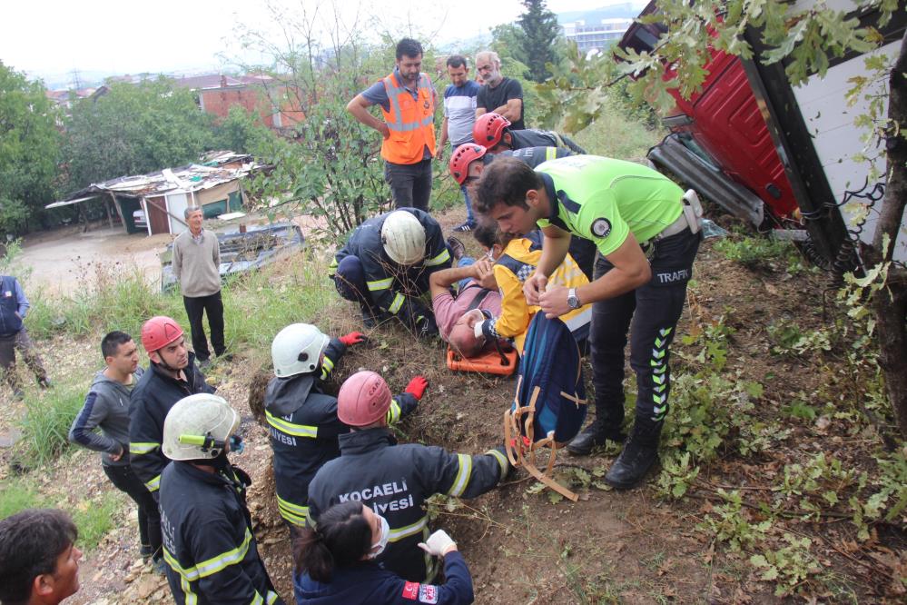 TEM Otoyolu Kocaeli geçişinde yağış sebebiyle kayganlaşan yolda sürücüsünün kontrolünden çıkan tır bariyerleri aşarak ağaçlık alana girdi. Kazada araç içerisinde sıkışan sürücü yaralandı.