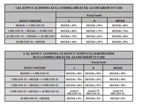 “Kurulun 24.02.2023 tarihli toplantısında, 23.02.2023 tarih ve E-24049440-045.01[4/5]- 77880 sayılı yazı ve ekinin incelenmesi sonucunda; – Bankaların Kredi İşlemlerine İlişkin Yönetmeliğin (Yönetmelik) “Konut, taşıt ve tüketici kredilerine ilişkin sınırlamalar” başlıklı 12/A maddesinin altıncı fıkrası uyarınca, Yönetmeliğin 12/A maddesinin birinci fıkrasında düzenlenen, tüketicilere, konut edinmeleri amacıyla kullandırılacak kredilerde ve taşıt kredileri hariç konut teminatlı kredilerde, kredi tutarının teminat olarak alınan konutun değerine oranının aşağıdaki tabloda yer aldığı şekilde belirlenmesine,