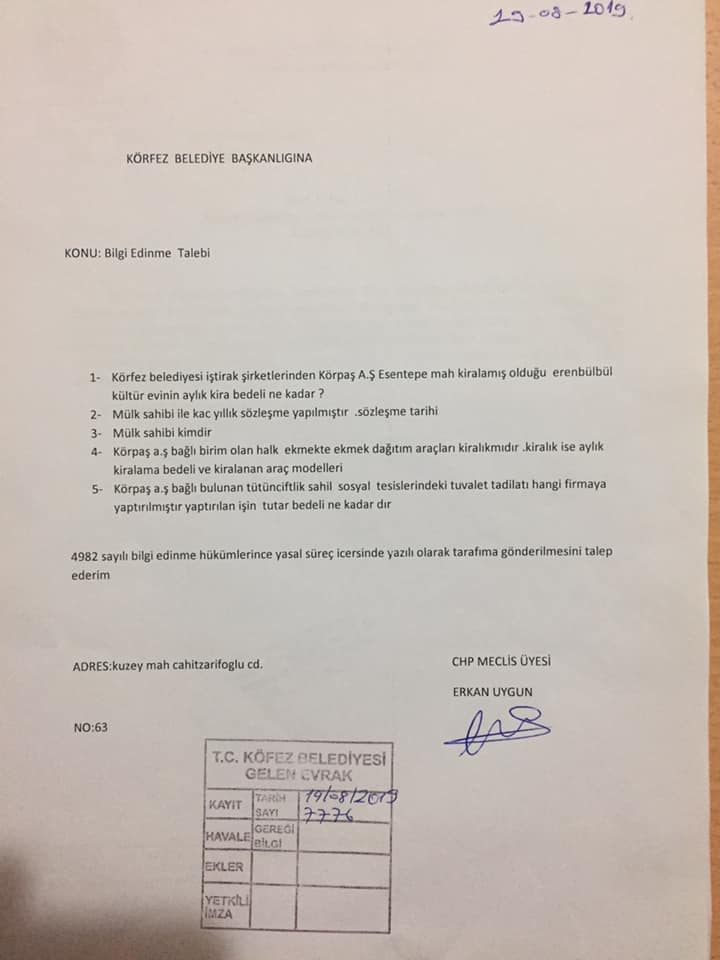 CHP Körfez Belediye Meclis Üyesi Erkan Uygun, Körfez Belediye Başkanlığı’na, yazılı cevaplandırılmak üzere 5 soru sordu. Eylül ayı meclisinde cevaplayacağız denilmesine rağmen, sorular cevabını bulmadı.