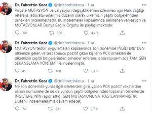 Bakan Koca Twitter hesabından yaptığı paylaşımda “virüs mutasyonu” ile ilgili, “Virüste mutasyon ve varyasyon değişikliklerinin izlenmesi için Halk Sağlığı referans laboratuvarlarımız düzenli olarak ülkemizin çeşitli bölgelerinden örnekleri incelemektedir.” değerlendirmesini yaptı.