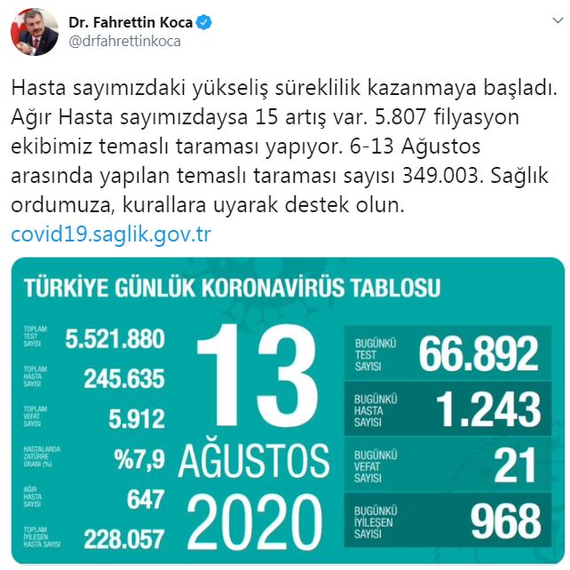 Sağlık Bakanı Fahrettin Koca, “Hasta sayımızdaki yükseliş süreklilik kazanmaya başladı. Ağır Hasta sayımızdaysa 15 artış var. 5.807 filyasyon ekibimiz temaslı taraması yapıyor. 6-13 Ağustos arasında yapılan temaslı taraması sayısı 349.003. Sağlık ordumuza, kurallara uyarak destek olun. ” ifadelerini kullandı.