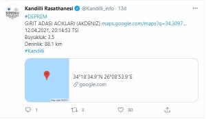 Son dakika haberine göre Akdeniz açıklarındaki Girit adası açıklarında 3,5 büyüklüğünde deprem meydana geldi. Depremin Türkiye saati ile 20.14’te meydana geldiği öğrenilirken, derinliğinin ise 88.1 kilometre olduğu kaydedildi.