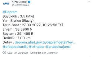 AFAD’tan yapılan açıklamaya göre, Elazığ’ın Sivrice ilçesinde saat 10: 26 sıralarında bir 3.5 şiddetindedeprem meydana geldi