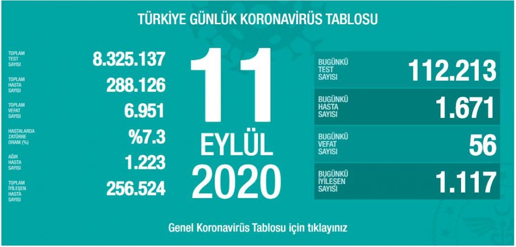 Sağlık Bakanı Fahrettin Koca, 11 Eylül tarihine ait Türkiye’deki korona virüs hasta ve vefat sayısını açıkladı. Bakan Koca’nın açıkladığı veriye göre Türkiye’de bugün bin 671 yeni hasta tespit edildi, 56 kişi ise hayatını kaybetti.