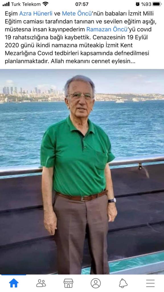 Kocaeli İzmit Yahya Kaptan Mahallesi Şelale Sokak No.20’de ikamet eden emekli Milli Eğitim Müfettişi 2 çocuk babası Ramazan Öncü(77) 10 gün önce rahatsızlanınca Seka Devlet Hastanesine götürüldü. Burada yapılan tetkiklerde covid-19 teşhisi konularak tedavi altına alınan Öncü, dün akşam saatlerinde yaşamını yitirdi. Her kesim tarafından çok sevilen Ramazan Öncü’nün cenazesi bugün İzmit Üçtepeler mevkiinde bulunan Kent mezarlığında toprağa verilecek