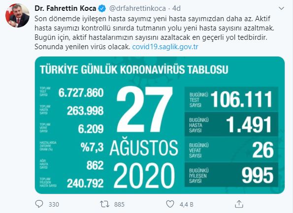 Sağlık Bakanı yaptığı açıklamada:” Son dönemde iyileşen hasta sayımız yeni hasta sayımızdan daha az. Aktif hasta sayımızı kontrollü sınırda tutmanın yolu yeni hasta sayısını azaltmak. Bugün için, aktif hastalarımızın sayısını azaltacak en geçerli yol tedbirdir. Sonunda yenilen virüs olacak.