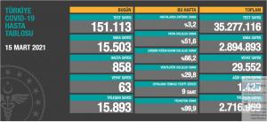 Bugün toplam 151 bin 113 test yapıldı. Semptom gösteren 858 kişiyle birlikte toplam 15 bin 503 yeni vaka tespit edildi. Türkiye’de toplam vaka sayısı 2 milyon 894 bin 893 oldu.