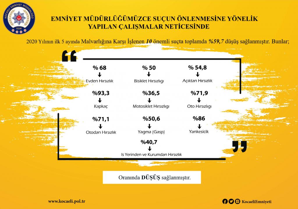 Görsel bir tablo ile yapılan açıklamada, Evden Hırsızlık, Bisiklet Hırsızlığı, Açıktan Hırsızlık, Kapkaç, Motosiklet Hırsızlığı, Oto Hırsızlığı, Otodan Hırsızlık, Yağma, yankesicilik ve İş yeri ya da kurumdan hırsızlık suçlarında ortalama yüzde 59,7 düşüş görüldü. Suç oranlarında ki düşüşte, Kocaeli İl Emniyet Müdürlüğünün, suçun önlenmesine yönelik yapmış olduğu çalışmalar dışında, son iki aydır Koronavirüs ile mücadele kapsamında yapılan sıkı denetimler ve sokağa çıkma yasaklarının da etkili olduğu görüldü. İnsanları oldukça kötü etkileyen Koronavirüs salgının, doğrudan sonra suç oranlarının düşmesine de iyi geldiği görüldü.