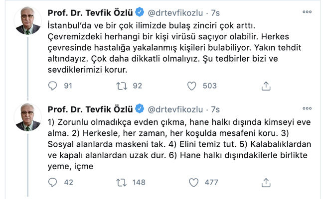 Özlü sosyal medya hesabından yaptığı paylaşımda, “İstanbul’da ve birçok ilimizde bulaş zinciri çok arttı. Çevremizdeki herhangi bir kişi virüsü saçıyor olabilir. Herkes çevresinde hastalığa yakalanmış kişileri bulabiliyor. Yakın tehdit altındayız. Çok daha dikkatli olmalıyız. Şu tedbirler bizi ve sevdiklerimizi korur.” düşüncesini dile getirdi.