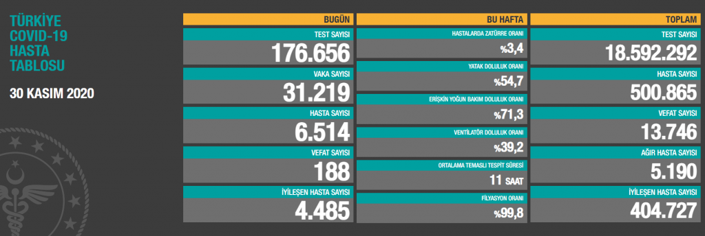 Sağlık Bakanı Fahrettin Koca, 30 Kasım tarihine ait Türkiye’deki korona virüs hasta ve vefat sayısını açıkladı. Bakan Koca’nın açıkladığı veriye göre Türkiye’de bugün 31 bin 219 kişiye korona virüse yakalandı. 188 kişi de korona virüs nedeniyle hayatını kaybetti. Son verilere göre hem vaka sayısında hem de vefat sayısında en yüksek döneme ulaşıldı.