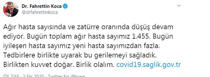 Sağlık Bakanı Fahrettin Koca, 2 Ekim günü itibari ile son 24 saatte gerçekleşen korona virüsle ilgili ölüm ve hasta sayısını paylaştı.