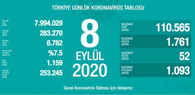 Sağlık Bakanı Fahrettin Koca, Türkiye’deki corona virüsü salgınıyla ilgili güncel verileri açıkladı. 8 Eylül Salı gününün tablosuna göre, son 24 saatte 52 kişinin hayatını kaybetmesi sonucu can kaybı 6 bin 782 oldu. Bugün bin 761 yeni vaka tespit edildi ve toplam vaka sayısı 283 bin 270’e yükseldi.
