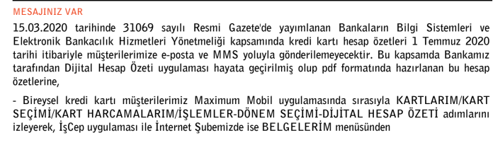 Konuyla ilgili İş Bankası’ndan müşterilerine gönderilen mesajda şu ifadeler kullanıldı;“15.03.2020 tarihinde 31069 sayılı Resmî Gazete’de yayımlanan Bankaların Bilgi Sistemleri ve Elektronik Bankacılık Hizmetleri Yönetmeliği kapsamında kredi kartı hesap özetleri 1 Temmuz 2020 tarihi itibariyle müşterilerimize e-posta ve MMS yoluyla gönderilemeyecektir. Bu kapsamda Bankamız tarafından Dijital Hesap Özeti uygulaması hayata geçirilmiş olup pdf formatında hazırlanan bu hesap özetlerine, Maximum Mobil, İŞ Cep Uygulaması ve İnternet Şubemizden ulaşılabilecektir’