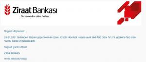 “Değerli Müşterimiz, 25.01.2021 tarihinden itibaren geçerli olmak üzere, Kredili Mevduat Hesabı aylık akdi faiz oranı %1,79, gecikme faiz oranı %2,09 olarak uygulanacaktır. Sağlıklı günler dileriz. Ziraat Bankası Mersis: 0998006967505633”