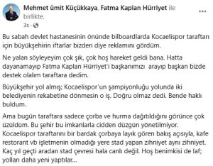 Kocaeli Büyükşehir Belediyesi tarafından Kocaelispor taraftarlarına iftarlık ikramda bulunuldu. CHP Kocaeli Büyükşehir Belediye Meclis Üyesi Mehmet Ümit Küçükkaya, taraftarlara verilen ikrama tepki gösterdi. Küçükkaya ‘ taraftarı bir bardak çorbaya layık gören bakış açısıyla, kafe restoran gibi işletmelerin olmadığı yere stat yapan zihniyet aynı zihniyet’ açıklamalarında bulundu.