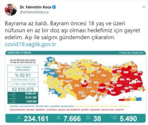 Sağlık Bakanı Fahrettin Koca, bugün yaptığı paylaşımda aşı çağrısını yineledi ve “Bayrama az kaldı. Bayram öncesi 18 yaş ve üzeri nüfusun en az bir doz aşı olması hedefimiz için gayret edelim. Aşı ile salgını gündemden çıkaralım” dedi.