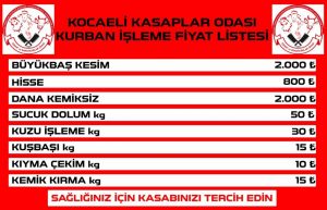 Kocaeli Kasaplar Odası Başkanı İsmail Şalgam, kurban işleme fiyat listesini açıkladı. İşte detaylar: