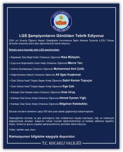 Kocaeli Valiliğince yapılan paylaşımda, “LGS şampiyonlarını gönülden tebrik ediyoruz. 2024 yılı sınavla öğrenci alacak ortaöğretim kurumlarına ilişkin merkezi sınavda (LGS) Türkiye birincileri arasında yerini alan öğrencilerimizi tebrik ediyoruz. İlimizin gurur kaynağı olan LGS şampiyonları: Başiskele Özel Bilgili Kültür Ortaokulu Öğrencisi Nisa Mülayim, Çayırova Akşemsettin İmam Hatip Ortaokulu Öğrencisi Merve Tan, Gebze Mustafapaşa Ortaokulu Öğrencisi Muhammed Anıl Çelik, Değirmendere Atatürk Ortaokulu Öğrencisi Ali Ilgaz Kuşkonar, Özel Gölcük Nazif Tokgöz Başarı Koleji Öğrencisi Sabri Kerem Topuçar, Özel Gölcük Nazif Tokgöz Başarı Koleji Öğrencisi Ege Çalı, Kartepe Özel Nesibe Aydın Ortaokulu Öğrencisi Uras Uruş, Kartepe Özel Sınav Koleji Ortaokulu Öğrencisi Ahmet Eymen Yiğit, Kartepe Özel Sınav Koleji Ortaokulu Öğrencisi Bilgehan Kelebekler sorulan soruların tamamını yapıp 500 tam puan alarak göğsümüzü kabartmışlardır. Geleceğimizin teminatı ve göz aydınlığımız olan evlatlarımızı hayata hazırlayan, bilgi ve medeniyet değerlerimizle donatan, başarının mimarı kıymetli öğretmenlerimize ve fedakar ailelerine teşekkür ediyor, ilimize bu gururu yaşatan şampiyonlarımızı gönülden tebrik ediyoruz. Yolları, bahtları açık olsun” denildi.