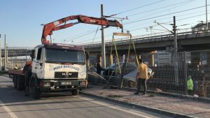 Kocaeli’de virajı alamayan lüks otomobil tren yoluna uçtu. Kazadan dolayı otomobil kaldırılana kadar tren seferleri iptal edildi. Yaklaşık 1 saat sonra otomobilin kaldırılmasıyla tren seferleri normal akışına döndü.
