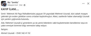Aile, Mehmet Uzunali’yi görenlerin ya da yerini bilenlerin vakit kaybetmeden kendilerine veya en yakın emniyet birimine bilgi vermesini talep ediyor.