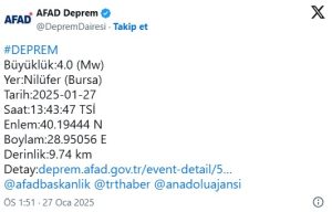 AFAD’ın verilerine göre, merkez üssü Bursa Nilüfer olan 4 büyüklüğünde deprem meydana geldi.