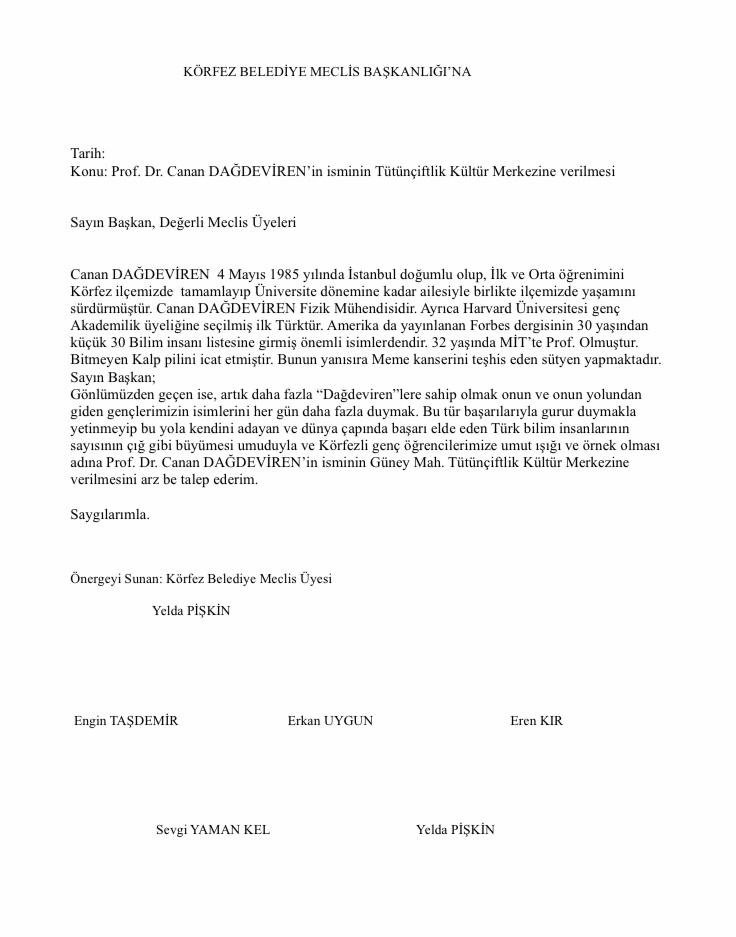 Yelda Pişkin’in vereceği önergelerden en önemlisi ise; Körfez Tütünçiftlik Kültür Merkezi’ne; ülkemizin dünya çapında yetiştirmiş olduğu en önemli bilim kadını olan bulduğu buluşlarla ‘Bilim Tarihi’ne adını altın harflerle yazdıran Canan Dağdeviren’in isminin verilmesi olduğu bildirildi. Bununla ilgili olarak önerge hazırlığı yapan Yelda Pişkin’e, diğer partinin gurup başkanlarının da destek vermesi bekleniyor. Yelda Pişkin, konuyla ilgili bilgi verdi. Pişkin, ” Bu konu;: bir milli mesele kadar önemlidir. Ülkemizin adını bilim alanında dünyaya duyuran Canan Dağdeviren’in adının Körfez Tütünçiftlik Kültür Merkezi’ne verilmesi; bizlerin ve yetkili kişilerin bilime ve bilim insanlarına sahip çıkığını gösterecektir. Vatandaşlarımızdan gelen yoğun talep üzerine ben bu önergeyi hazırladım’ dedi. Ayrıca yeni evlenecek çiftlere belediye tarafından ‘Evlilik’ konulu seminerlerin verilmesi konusunda da önerge vereceği bildirildi.