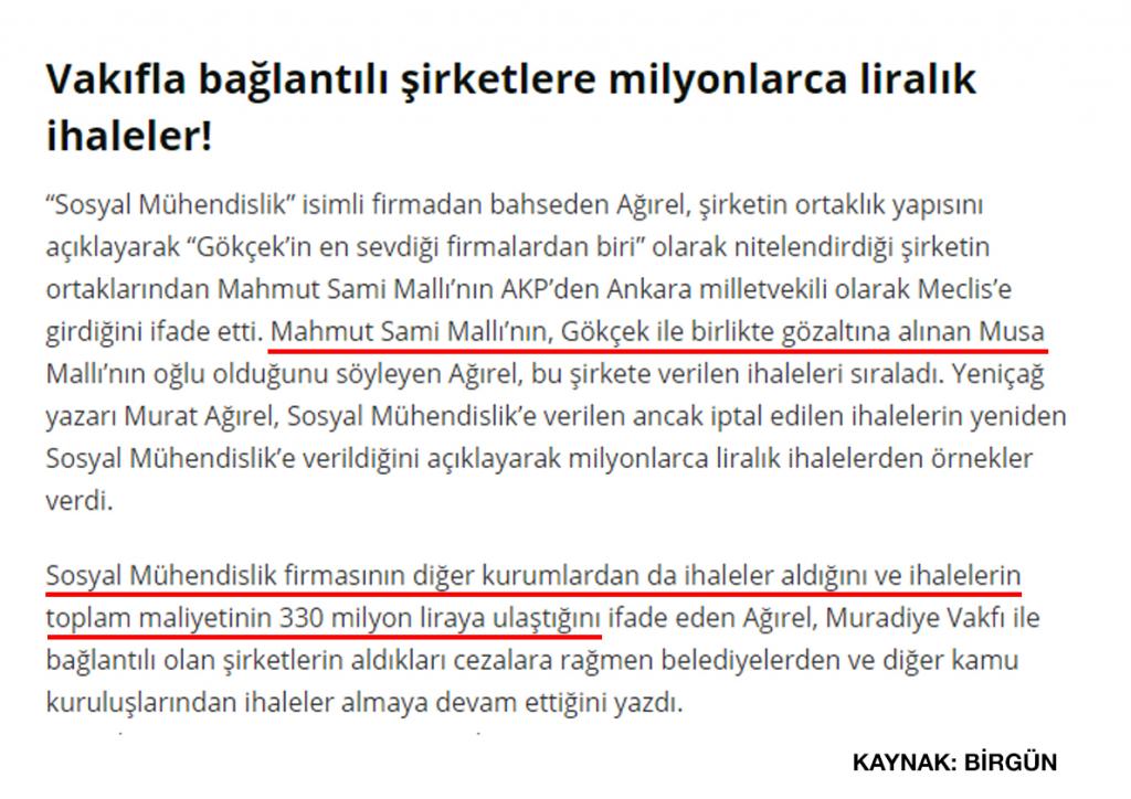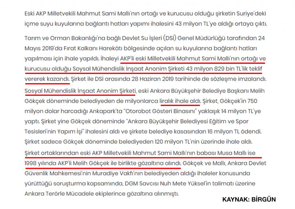 Melih Gökçek’in Ankara Büyükşehir Belediye Başkanlığı yaptığı dönemde Mahmut Mallı 120 Milyon TL’lik altyapı ihalesi almış. 24 Mayıs 2019’da da Fırat Kalkanı Harekatı’nda da 43 milyonluk Devlet Su İşleri’nin ihalesini aldı. Mahmut Sami Mallı 330 milyonluk iş yapmıştır. Tüm bunlar yetmezmiş gibi bir de Darıca’daki 80 milyonluk altyapı ihalesini almış. Mallı’nın Ankara’da doyduğu yetmedi mi?