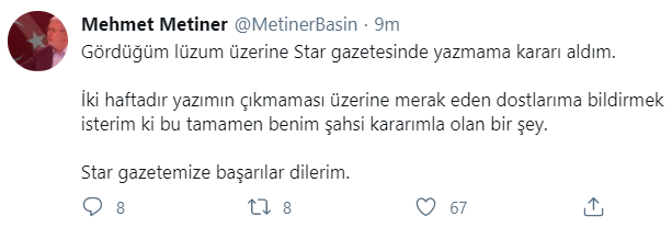 Gördüğüm lüzum üzerine Star gazetesinde yazmama kararı aldım. İki haftadır yazımın çıkmaması üzerine merak eden dostlarıma bildirmek isterim ki bu tamamen benim şahsi kararımla olan bir şey. Star gazetemize başarılar dilerim.
