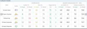 Önümüzdeki hafta hava sıcaklıkları mevsim normallerinde seyredecek. Bugün (pazar) en düşük 6, en yüksek 19 derece sisli olacak. Pazartesi ise en düşük 8, en yüksek 23 parçalı bulutlu. Salı en düşük 11, en yüksek 24 parçalı bulutlu. Çarşamba en düşük 12, en yüksek 23 parçalı bulutlu. Perşembe ise en düşük 11, en yüksek 23 derece sağanak yağışlı olacak.