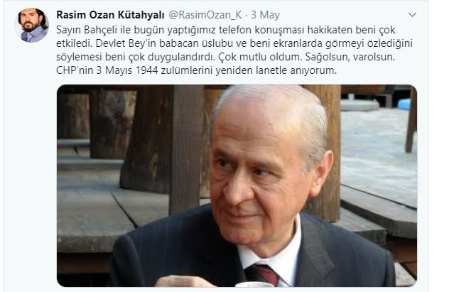 Rasim Ozan Kütahyalı’nın Twitter’dan dün yaptığı paylaşımda MHP Genel Başkanı Devlet Bahçeli’nin Beyaz TV’deki sözleri için kendisini telefonla arayarak teşekkür ettiğini belirtmesi MHP’de çatlak oluşturdu.